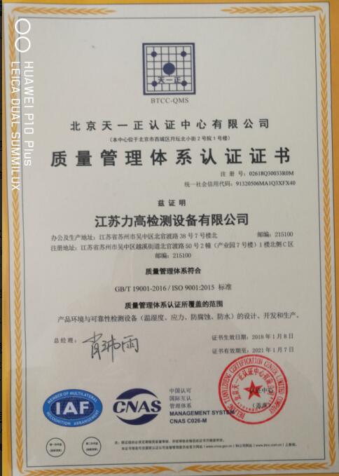 江蘇力高檢測設(shè)備憑借一貫的高標準、嚴要求、規(guī)范化生產(chǎn)管理及在生產(chǎn)實踐中結(jié)合國內(nèi)外先進生產(chǎn)經(jīng)驗所建立起來的完整、規(guī)范的生產(chǎn)體系,確保了企業(yè)生產(chǎn)的每一件產(chǎn)品都是高質(zhì)量,符合國家標準。在長期的堅守中,形成產(chǎn)品生產(chǎn)質(zhì)量規(guī)范化,順利通過了ISO9001國際質(zhì)量管理體系認證。