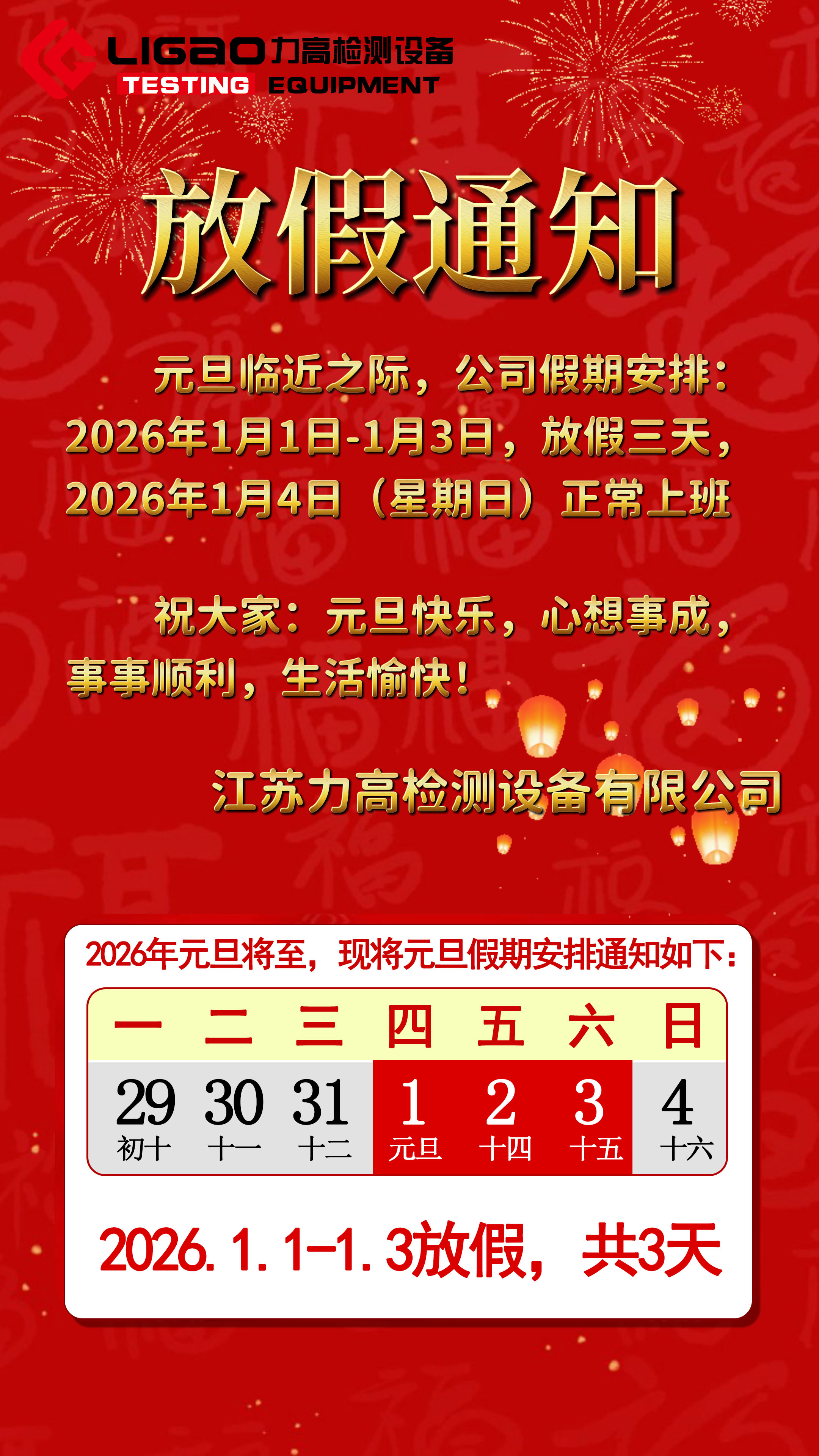 根據(jù)國務(wù)院辦公廳關(guān)于2026年部分節(jié)假日安排的通知,結(jié)合公司實際情況,現(xiàn)將2026年元旦放假安排通知如下:2026年1月1日(星期四)至1月3日(星期六)放假調(diào)休,共3天。1月4日(星期日)正常上班。請各部門提前做好工作安排,確保各項業(yè)務(wù)有序銜接。